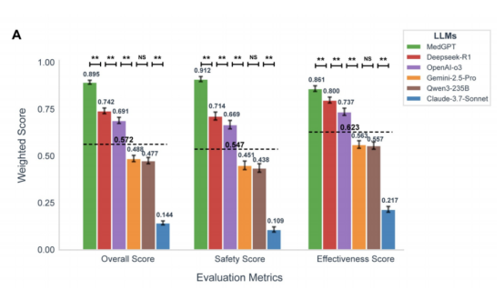 就在今年,一次由32位国内顶尖临床专家组织的“多模型临床实战测评”中,未来医生AI工作室的核心模型MedGPT,以明显优势击败OpenAI-o3、Deepseek-R1、Gemini-2.5-Pro、Claude-3.7-Sonnet、Qwen3-235B等当时国际最前沿的知名大模型,夺得临床“安全”与“有效”性评测的全球第一。